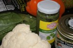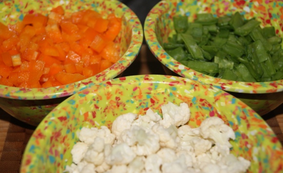 up if I have them on hand) so I grabbed the remainder of a head of cauliflower, an orange bell pepper, and several handfuls of snap peas. I also grabbed olive oil, Persian Lime EVOO, Sicilian Lemon Balsamic, coriander chutney, Tabasco, Salt, & Pepper.