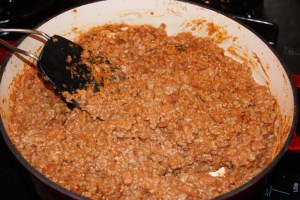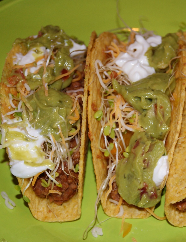 Ok… so enough of that… last night’s dinner was ground pork tacos. A slight switch from my normal ground turkey tacos since I still have a ton of pork in the freezer from Wilbur2012. It’s a simple recipe. Brown pork (or turkey or beef), add one can of fat free refried beans (i use one can per pound of meat), taco seasoning, and bottled taco sauce (to taste) cook together on low heat.