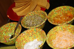 The tacos were topped with non-fat Greek yogurt, diced yellow tomato, guacamole, sprouts, and a bit of cheese… they were deelish!